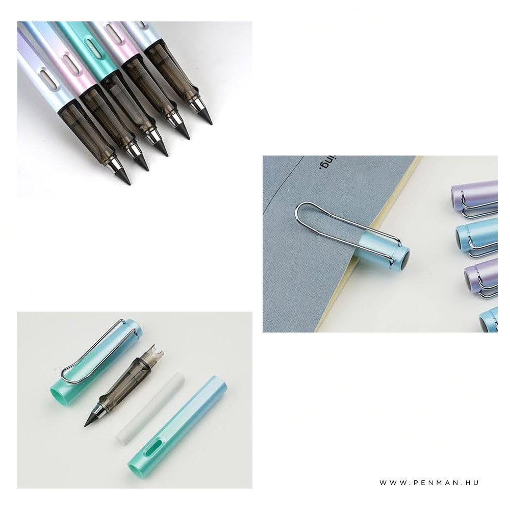 Ez az örökíró ceruza praktikus és modern megoldás a mindennapi használathoz. A speciális grafit hegynek köszönhetően egyenletes, tiszta vonalvezetést biztosít, miközben nincs szükség hegyezésre vagy tinta utántöltésre, így kényelmes és időtakarékos alternatívája a hagyományos ceruzáknak.