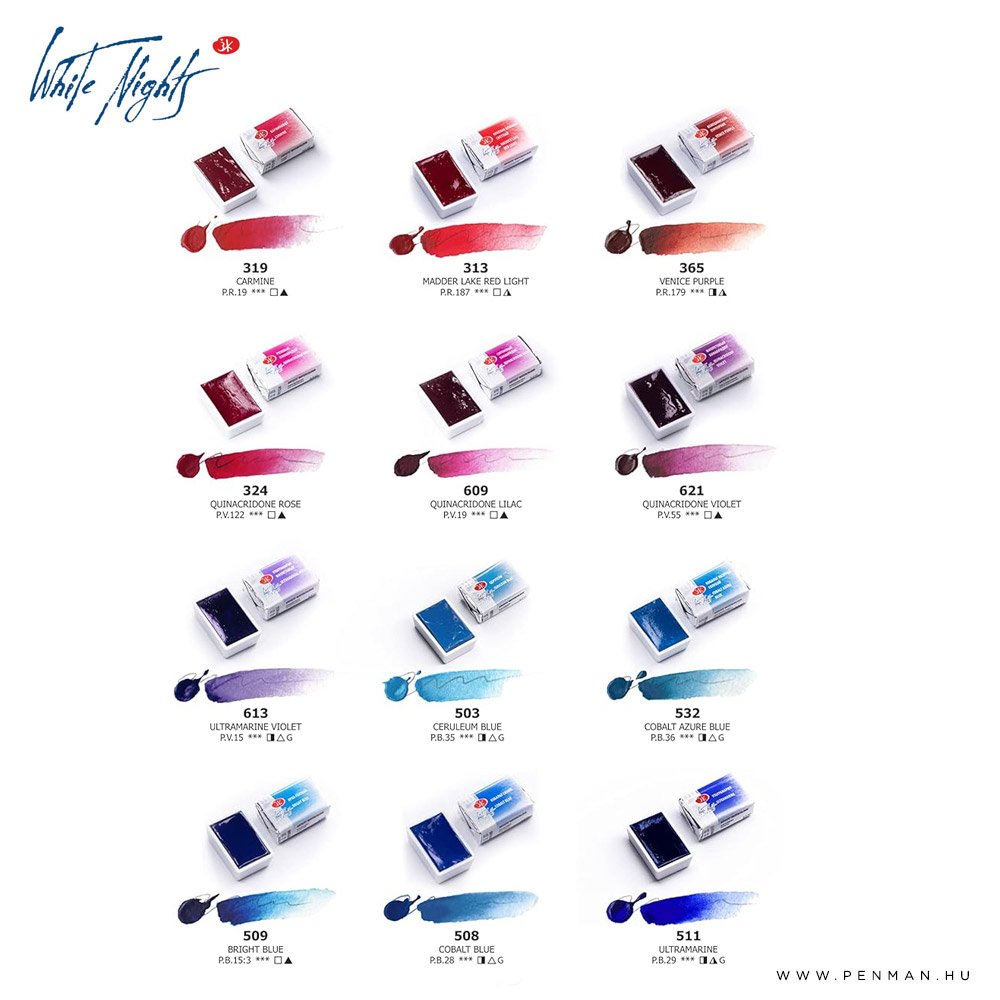 A White Nights 35 szilke fém dobozos akvarell festékkészlet egy prémium minőségű választás mind kezdő, mind haladó művészek számára. A Szentpéterváron gyártott White Nights festékek a világ egyik legismertebb akvarelljei, melyeket nagy pigment tartalom, élénk színek és kiváló fényállóság jellemez. A készletben található 35 darab teljes szilke, (full pan) amely hosszú ideig biztosítja a kreatív munkát. A masszív, hordozható fém doboz nemcsak esztétikus, hanem praktikus is. Tartalmaz keverőfelületet, biztonságosan rögzíti a szilkéket, és könnyedén magunkkal vihetjük utazások, szabadtéri használatok során. A festékek könnyen oldódnak vízben, áttetsző, mégis intenzív rétegeket hoznak létre, így ideálisak mind akvarell technikák gyakorlásához, mind részlet gazdag művek létrehozásához. A White Nights 35 színű készlet színpalettája gazdag és harmonikus, lefedve a legfontosabb tónusokat.