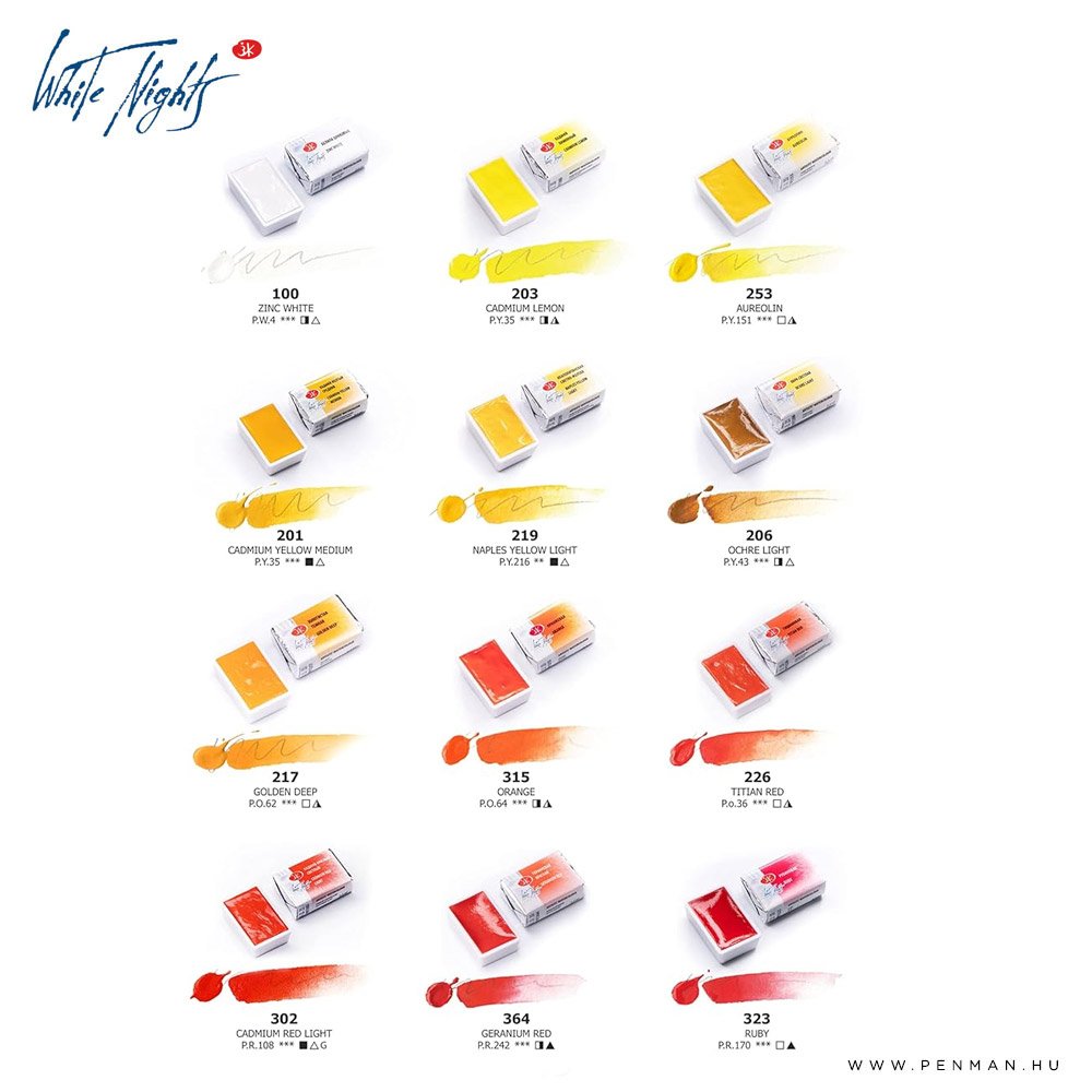 A készlet az alábbi szeneket tartalmazza: 100 White, 203 Cadmium Lemon, 253 Aureolin, 201 Cadmium Yellow Medium, 219 Naples Yellow Light, 206 Ochre Light, 217 Golden Deep, 315 Orange, 226 Titan Red, 302 Cadmium Red Light, 364 Geranium Red, 323 Ruby, 319 Carmine, 313 Madder Lake Red, 365 Venice Purple, 324 Quin Rose, 609 Quinacridone Lilac, 621 Quinacridone Violet, 613 Ultramarine Violet, 503 Ceruleum, 532 Cobalt Azure Blue, 509 Bright Blue, 508 Cobalt Blue, 511 Ultramarine, 521 Ultramarine Deep, 516 Indigo, 531 Cobalt Turquoise, 713 Emerald Green, 745 May Green, 716 Sap Green, 405 Raw Sienna, 406 Burnt Sienna, 408 Burnt Umber, 801 Lamp Black, 812 Payne’s Gray